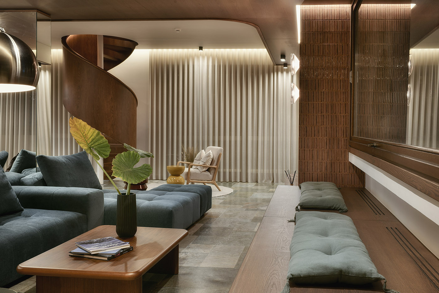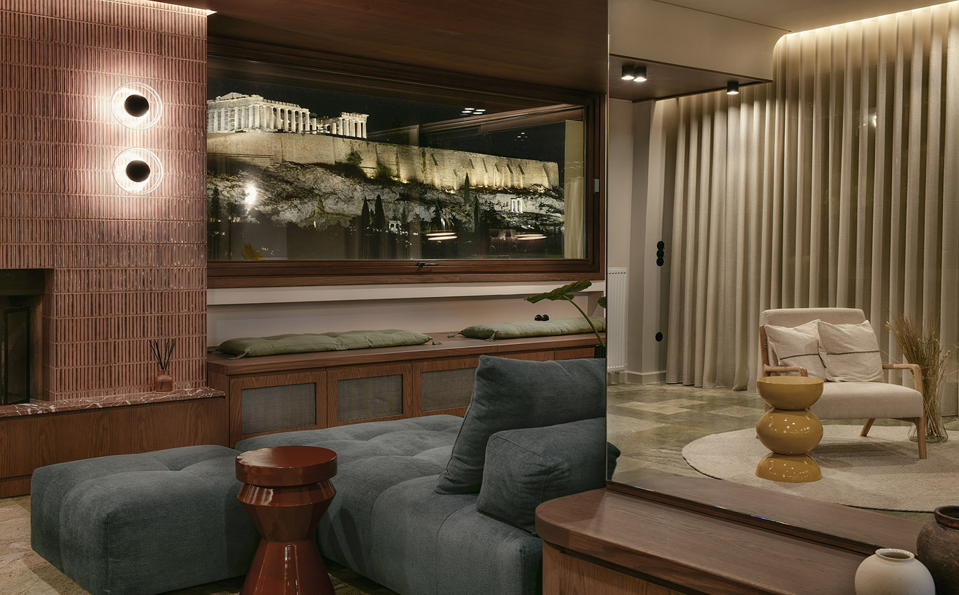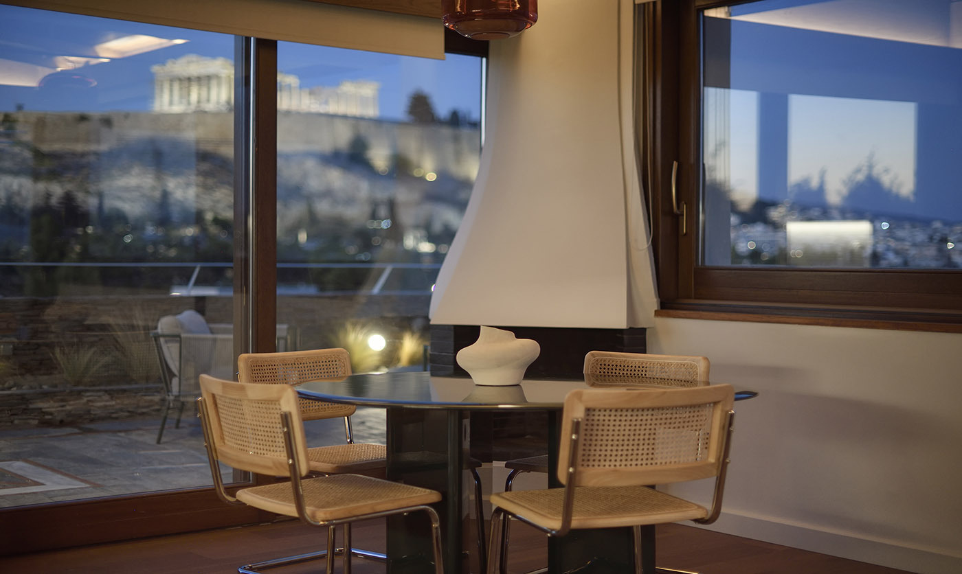 Loft - Κατά την άνοδο στο ανώτερο επίπεδο του loft, βρίσκεται ένα υπέροχο, ευρύχωρο, δεύτερο καθιστικό με τζάκι, καθώς και μια μικρή κουζίνα και WC για την άνεση των επισκεπτών. Οι γυάλινοι τοίχοι καλύπτουν περιμετρικά το χώρο στο μεγαλύτερό τους μέρος, ξεδιπλώνοντας την εξαιρετική πανοραμική θέα της Αθήνας. Σε κάθε πλευρά του loft υπάρχουν δύο ευρύχωρες, πετρόχτιστες βεράντες με κήπους με καθηλωτική θέα στην Ακρόπολη και την πόλη της Αθήνας μέχρι εκεί που φτάνει το μάτι. Λόγω της τοποθεσίας και της αρχιτεκτονικής του Karyatis Luxury Maisonette, το οποίο φαντάζει σαν να σμιλεύτηκε στην κορυφή της πόλης, η απόσταση μέχρι την Ακρόπολη είναι σχεδόν μηδαμινή παραθέτοντας αυτή την μαγευτική θέα που κόβει την ανάσα.